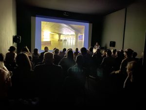 Marck Leckey speaking in CAST_s black box screening space, June 2022